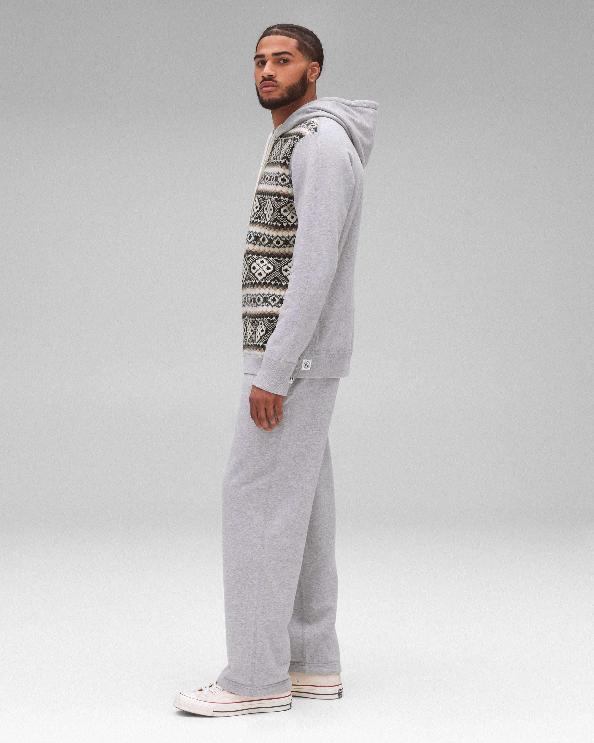 先見の明を持つ日本が誇るアトリエ'Junya Watanabe'がFW24コラボレーションの一環として、再び Reigning Champの定番を再構築。限定のMidweight Terry Sweatpantは生地に伝統的なパターンのシェットランドウールを使用したジャカードニットパネルで仕上げています。Relaxed Fitとシグネチャーのディテールが特徴。